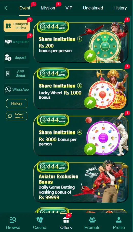 - Free bonuses: Usually, in casino games, especially Pakistani casino games, if there are no bonuses, users ignore those games, but not this time. C444 provides countless bonuses like registration bonus, invitation bonus, promotion bonus, and many more.